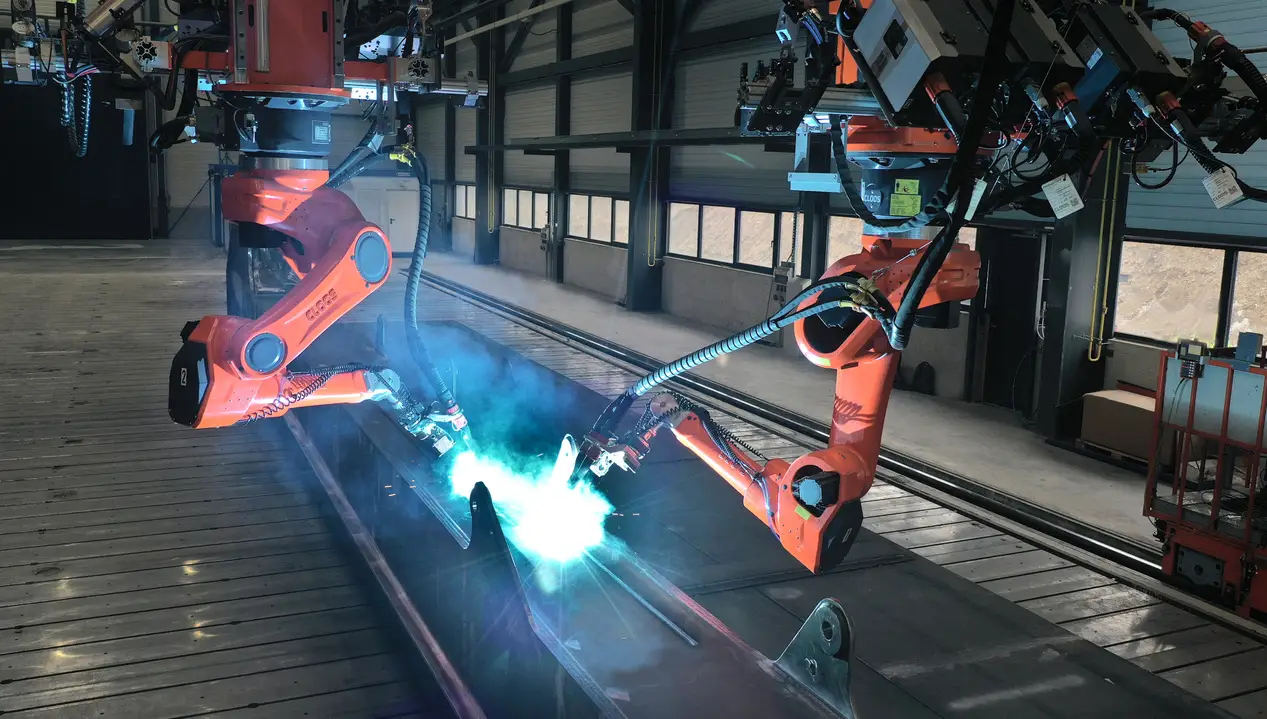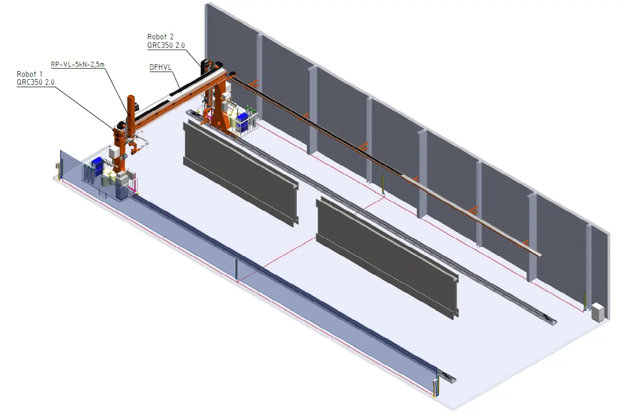 A nagy munkadarabok hegeszthetősége miatt a robotkarok egy felső portálra kerültek, mely egy sínpályán képes az egész rendszert 33 méteres hosszon mozgatni.